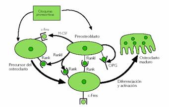 El RANK (Receptor for Activation of Nuclear Factor KB; NFkB) es un receptor de los osteoclastos, al que se une el RANKL (ligando de RANK) presente en la membrana de las células de estirpe osteoblástica y del estroma medular. Esta unión estimula la proliferación y actividad de los osteoclastos, inhibiendo su apoptosis. Por otro lado, los osteoblastos producen un receptor soluble, osteoprotegerina (OPG), que es capaz de unirse al RANKL, impidiendo la unión RANK-RANKL, por lo que su acción es inhibidora de la actividad osteoclástica(16). Es, por tanto, la relación entre RANKL y OPG lo que determina la cantidad de resorción ósea. El osteoblasto produce, además, el factor estimulante de colonias de monocitos (M-CSF), que se une al receptor C-Fms de los osteoclastos, siendo también necesario para la osteoclastogénesis y complementario a la acción del sistema RANK-RANKL